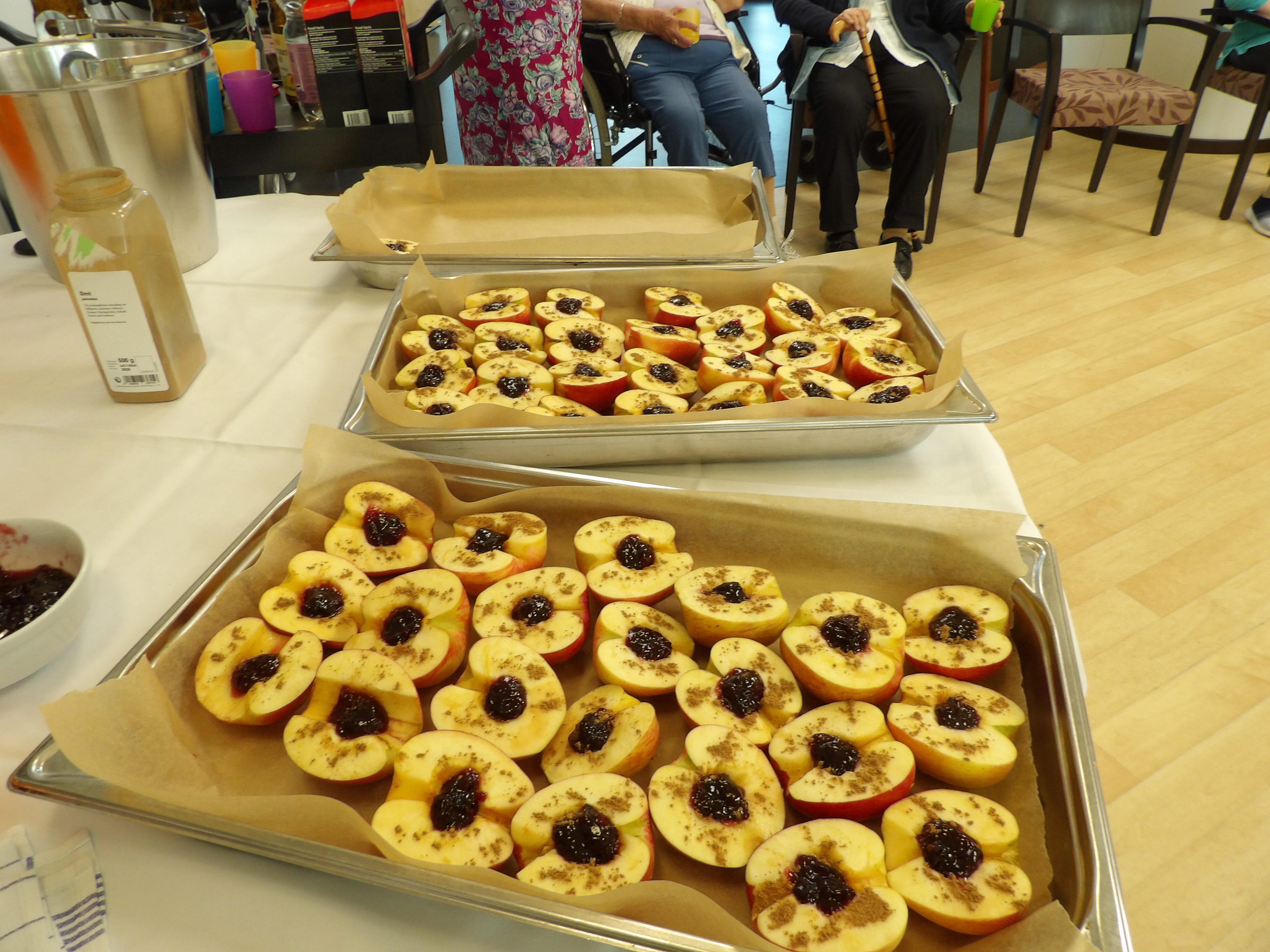 Im Herbst schmeckt ein warmer Apfel am besten, dies kennen viele Bewohner noch von früher. Es wurde durch die Betreuungsmitarbeiter viel über den Apfel erzählt, und sämtliche Köstlichkeiten wurden aufgezählt. An diesem Nachmittag gab es gefüllte Äpfel mit Marmelade und Schlagsahne. Eins mussten wir aber lernen, das nächste Mal müssen wir auf jeden Fall noch mehr Äpfel zubereiten, denn es war ein Gaumenschmaus.