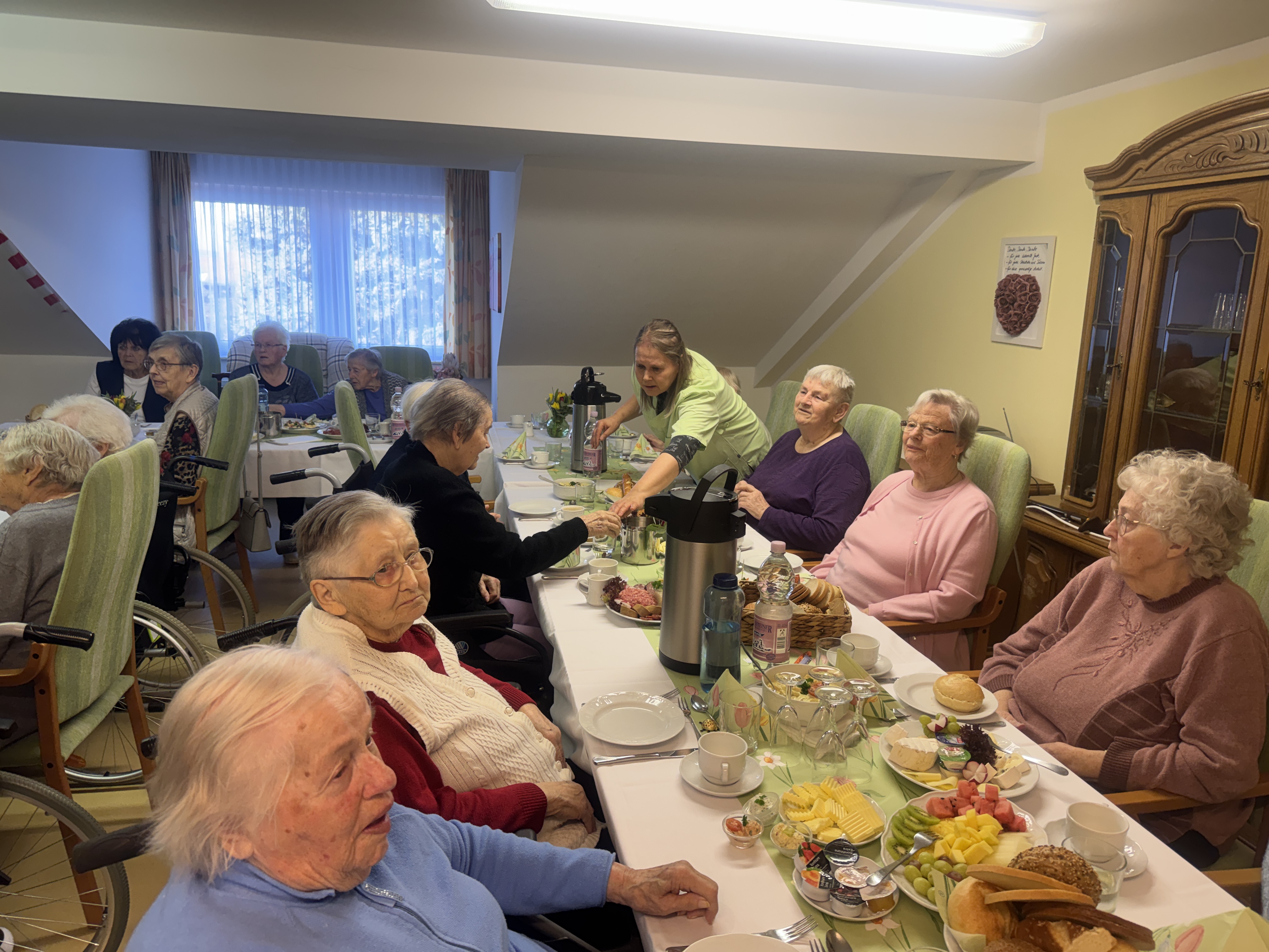 Anschließend konnten sich die Bewohnerinnen über ein liebevoll zubereitetes, zünftiges Frühstück freuen. Die Mitarbeiterinnen und Mitarbeiter der Küche hatten eine reichhaltige Auswahl zusammengestellt: frische Brötchen, eine vielfältige Fisch- und Wurstplatte sowie verschiedene Salate und köstliche Dips ließen keine Wünsche offen.