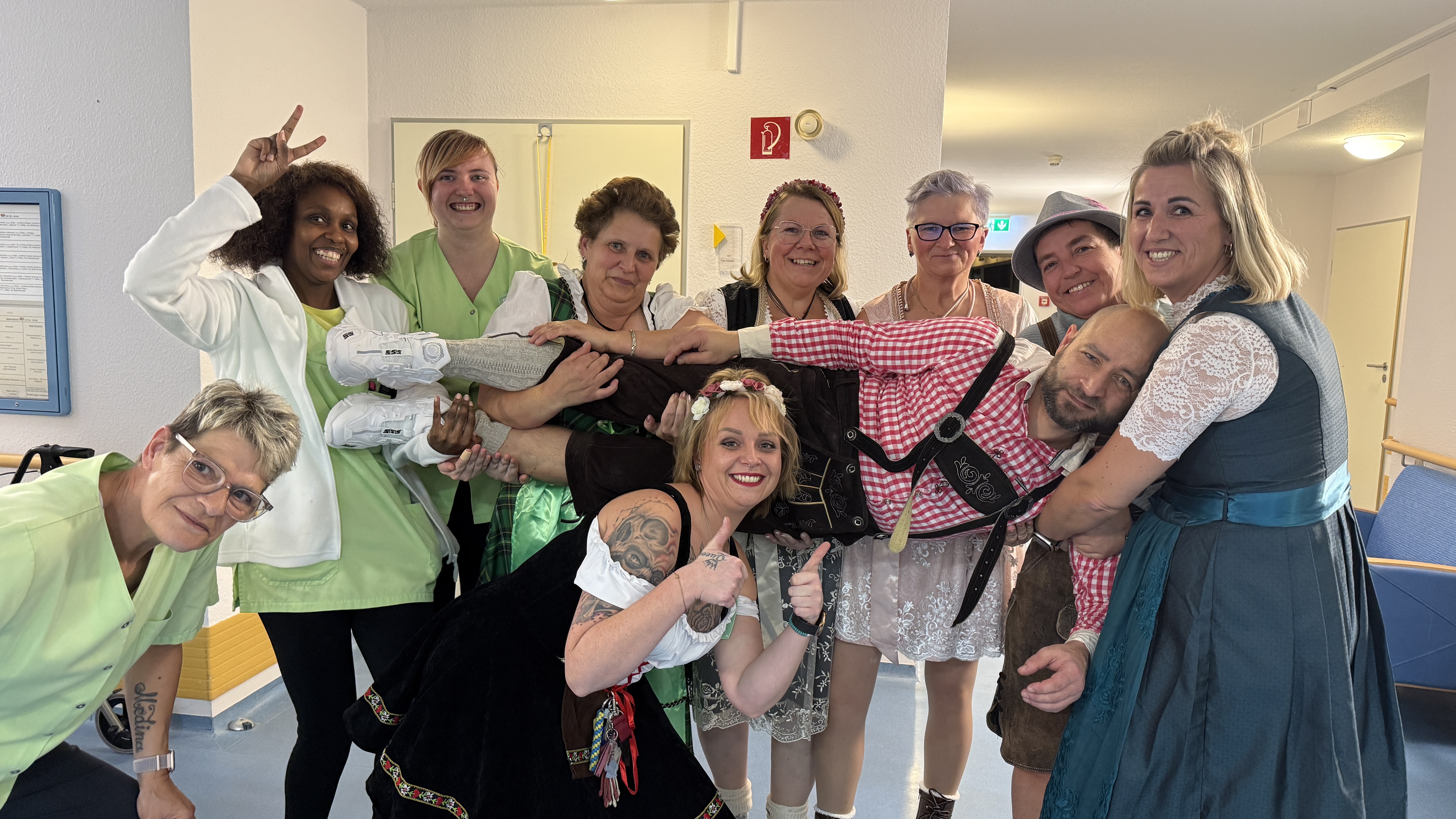 Sowohl Mitarbeitende als auch einige Seniorinnen und Senioren hatten sich liebevoll verkleidet und trugen Dirndl, Trachtenhemden und lustige Accessoires. Die ausgelassene Stimmung erfüllte den ganzen Raum – es wurde geschunkelt, gelacht und sogar getanzt.