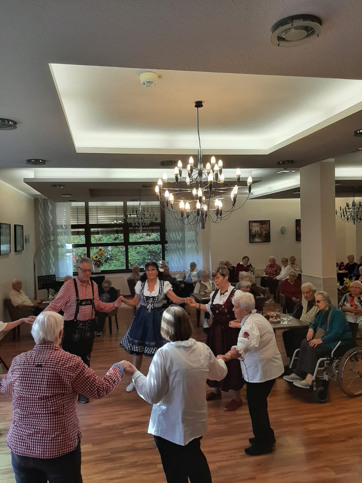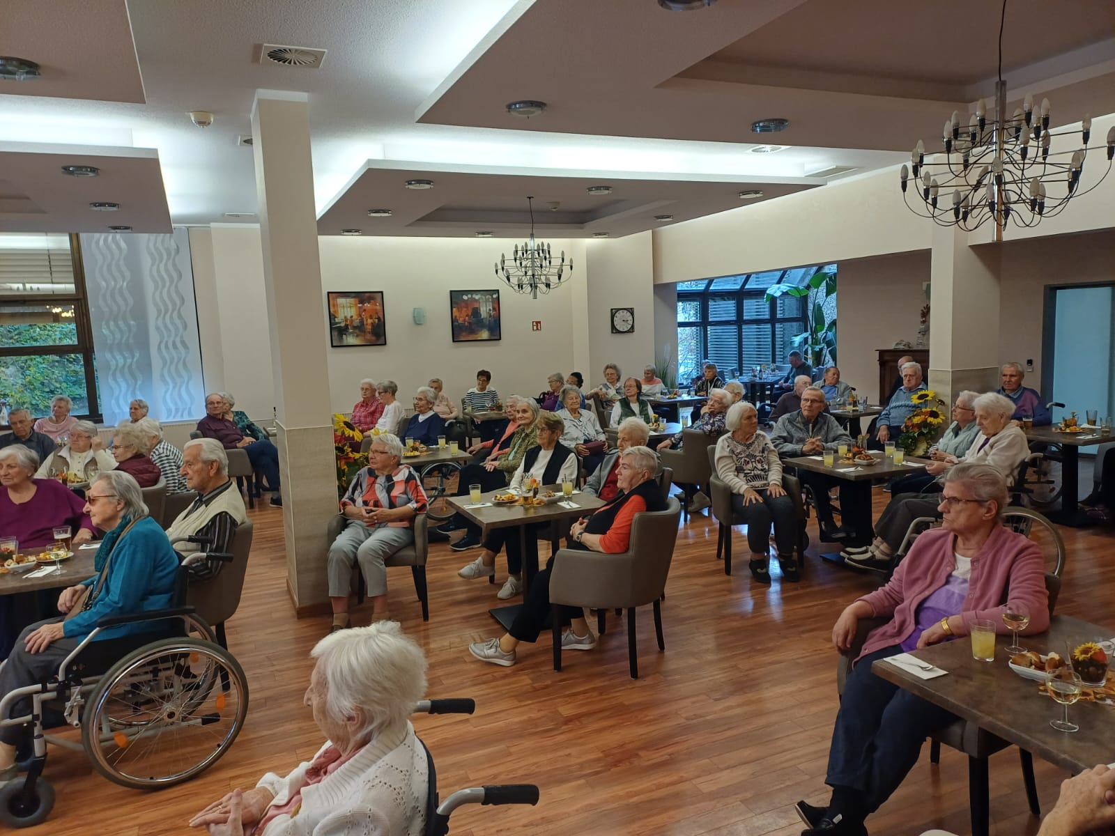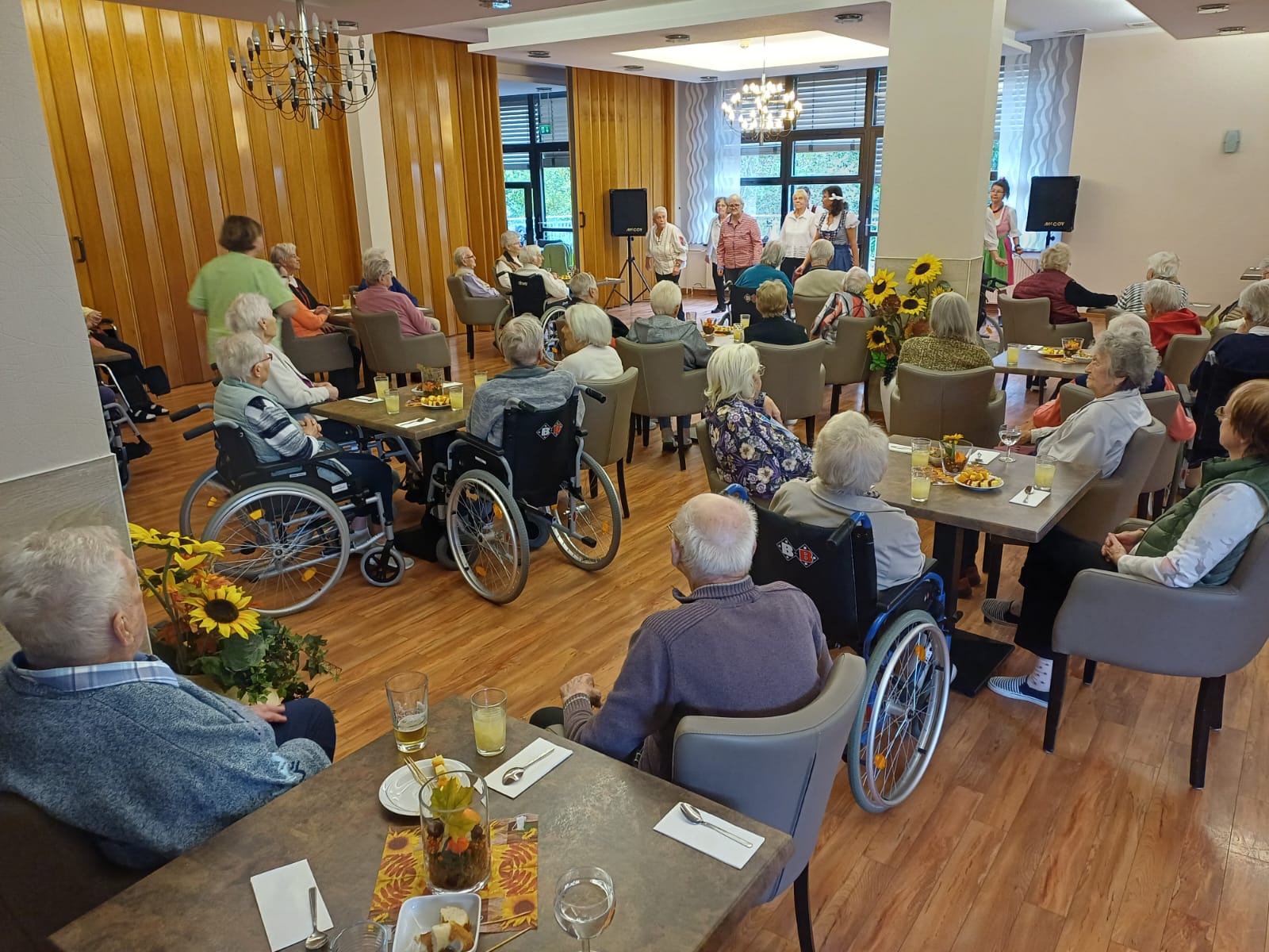 Die Betreuungskräfte hatten am Vortag gemeinsam mit den Bewohnern Kürbiskuchen auf den Villen gebacken, den sie zur Kaffeezeit genüsslich verspeisten. Im Anschluss daran wurde der Startschuss für das Herbstfest im Restaurant gegeben. Die Tanzgruppe „Lindenblüten“ hatten eine Tanzshow für unsere Bewohner vorbereitet. „HouseMaster“ DJ Nico gab dazu den musikalischen Ton an. Die Tische waren herbstlich gedeckt und kleine Spieße und ein Gläschen Wein sorgten noch ein weiteres Mal an diesem Tag für kleine Gaumenfreuden. Es wurde nicht nur getanzt, sondern auch gelacht, geschunkelt und applaudiert. Das Resümee: Eine rundum gelungene Tagesveranstaltung für alle Beteiligten.